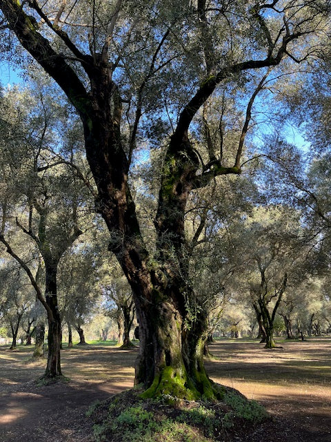 Con il passo calmo di chi percorre un luogo sacro, Domenico ci conduce al suo olivo preferito, il più antico di tutti, posto al centro della piantagione. Da quattrocento anni produce le olive più belle, generando molte delle piante secolari, alcune nate dalle sue stesse radici.